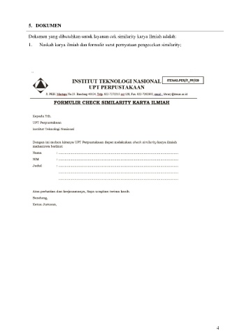 5. DOKUMEN Dokumen yang dibutuhkan untuk layanan cek similarity karya Ilmiah adalah: 1. Naskah karya ilmiah dan formulir surat pernyataan pengecekan similarity; 4